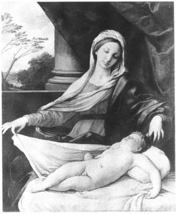 Auch an anderer Stelle rächt sich die durch die Fülle an vorzustellenden Werken provozierte Oberflächlichkeit der Diskussion, wenn etwa übersehen wird, dass die vorgestellten 'Selbstbildnisse mit Familie' (102 ff.) einer sehr viel komplexeren Ikonografie folgen, als hier durch die vage Formulierung von den darin übernommenen 'Elementen des Staatsporträts' nahe gelegt: Tatsächlich folgt zum Beispiel das Bild Antoine Pesnes in Hintergrundgestaltung und Figurenarrangement Pierre Mignards "Famille du Grand Dauphin" (1687; Versailles, Musée National du Château), nur dass nun durch die fast symmetrische Gegenüberstellung von Maler und Leinwand und die Ausrichtung der Familie auf letztere ein eigener Herrschaftsbereich für den Künstler definiert wird. Desgleichen beschreibt Klingsöhr-Leroy das Bild des Nicolas de Largillière lediglich (105 f.), ohne zu erkennen, dass gerade die Mutter-Kinder-Gruppe rechts hochgradig mit Bedeutung aufgeladen ist, wird doch jedem ihrer Mitglieder eine besondere Rolle zugewiesen, wenn in der Darstellung der Ehefrau Elemente der Musen-Ikonografie mit Darstellungstraditionen der den Schleier von dem Jesuskind lüftenden Maria verschmolzen werden. Tatsächlich folgt das Motiv des schlafenden Kindes einem durch Sassoferrato im 17. Jahrhundert populär gemachten Madonnentyp (siehe hier ein Beispiel aus der Galleria Estense in Modena). Auch das von Pierre Mignard inszenierte, raffinierte "Bild im Bild"-Spiel in dessen "Lukas"-Gemälde schöpft Klingsöhr-Leroy nicht recht aus, wenn sie es lediglich als Niederschlagsbecken von Theorien zum Primat des "dessein" liest (136), während der Maler tatsächlich weit darüber hinausgeht: Indem er seinem der Szene eingefügten Selbstbildnis nicht die Entwurfszeichnung zu dem ganzen, sondern lediglich zu dem von dem Heiligen Lukas gemalten Bild auf der Staffelei in die Hand gibt, macht er deutlich, dass auch das "dessein" in einem größeren Kontext übergriffen sein muss, um zur Realisierung zu finden.[2]
